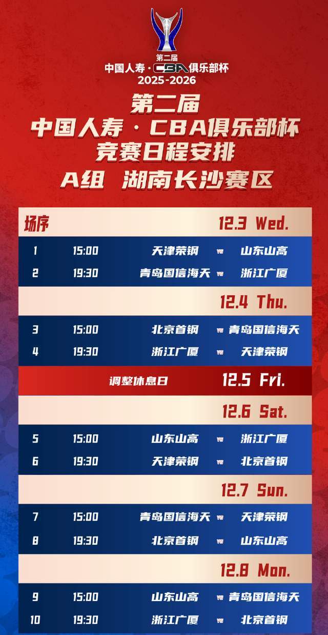 小组赛结束之后,第二阶段决赛阶段的比赛则将于2026年2月6日-12日在内蒙古自治区呼和浩特市进行。届时,CBA联赛已经开始了,看看谁能在联赛中期,捧起第二届俱乐部杯赛的冠军吧。