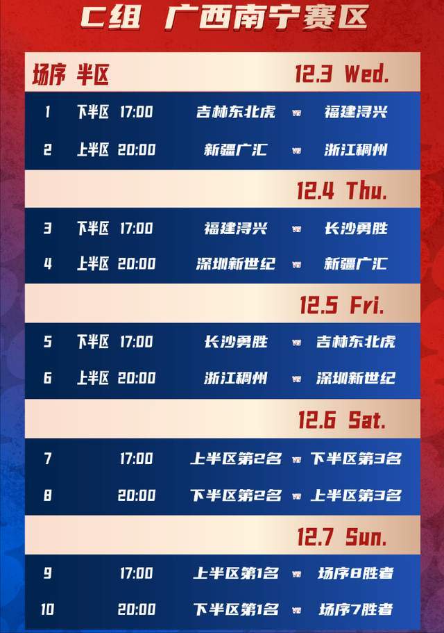 根据赛程规则,小组赛将于2025年12月3日-8日在湖南长沙、江西南昌、广西南宁和湖北武汉四个赛区进行。11月14日,小组赛赛程火热出炉!