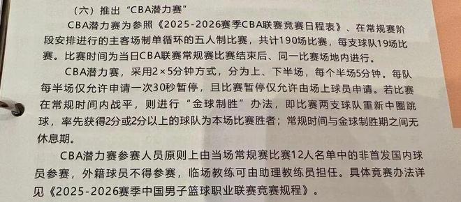CBA在25日召开了股东大会,篮协定的“CBA潜力赛”已经当作文件下发给各俱乐部负责人和主教练,新赛季将会正式实施。另外新赛季的单节时间也确定了,会缩短为10分钟。至于出现欠薪情况的四川男篮能否出战新赛季,目前还没有确切的结果。