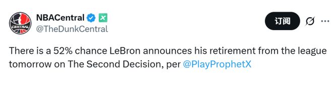 北京时间10月7日,勒布朗-詹姆斯突然更新社媒写道:“所有决定中的决定,10月7日,美东中午12点(北京时间10月8日凌晨0点)”。对此,美国顶级体育预测市场ProphetX认为,詹姆斯明天宣布退役消息的概率为52%。知名美媒CBS分析了詹姆斯的这一预告,质疑湖人超巨多次借“退役”炒作,真正决定时恐怕没人相信了。以下是CBS的解析——