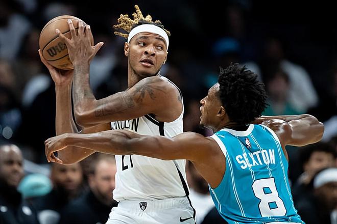 本场比赛中,篮网的先发中锋诺阿-克劳尼(Noah Clowney)的表现依然是一塌糊涂的水平,依然是没有任何的起色。克劳尼全场出场15分04秒,投篮2中0,三分线外2中0,全场1分未得,仅贡献5篮板2助攻的数据,还有2次失误和1次犯规,正负值为-6。克劳尼在进攻端毫无贡献,他的得分能力并没有发挥出来,他的手感依然很不理想,他也没有什么其他方面的才能,他在进攻端的表现一无是处。不仅如此,克劳尼在防守端的表现也是惨不忍睹的,他也是没有发挥出自己在防守端的特点,没有展现出任何的作用。克劳尼也算是得到了不少的出场时间,然而他在场上的效果实在是有些不尽如人意,在攻防两端看起来都没有任何的存在感。
