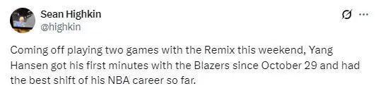 北京时间11月19日,NBA常规赛,开拓者主场110-127不敌太阳。中国球员杨瀚森被召回,时隔20天出现在NBA赛场,他首次获得双位数登场时间,出场13分8秒,7中4贡献9分5篮板3助攻1盖帽,得分、篮板和助攻均为生涯新高,有多次高光得分时刻,让大家看到他更加从容自信的一面。
