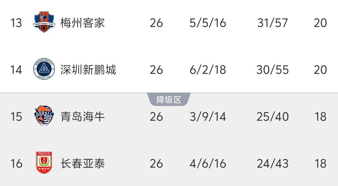 中超最新积分榜:降级3选2,梅州亚泰自救艰难,国安保级送分童子