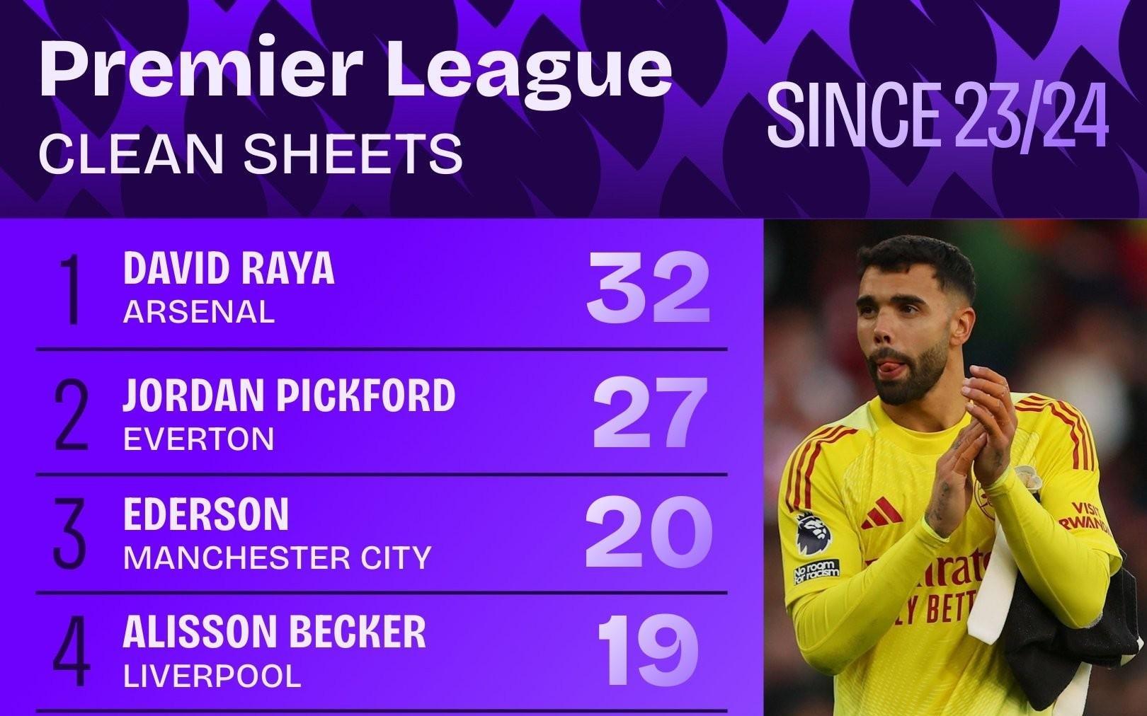 加盟阿森纳至今拉亚在英超32次零封,同期所有门将第一