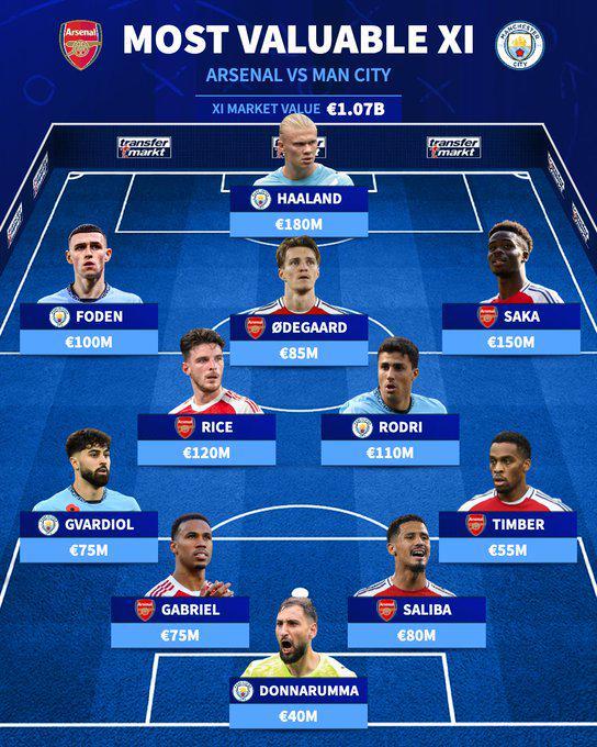 枪手vs曼城最贵阵容:哈兰德1.8亿欧领衔,廷贝尔在列