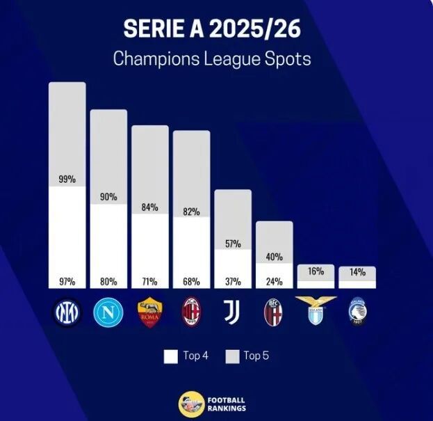 根据Footballrankings的预测,意甲有28%的概率下赛季五队征战欧冠。