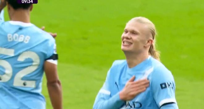 比赛开始仅仅8分钟,格瓦迪奥尔后场长传,哈兰德扛住后卫之后左脚劲射破门,1比0!在各项赛事里,哈兰德连续7场进球,共打入10球。