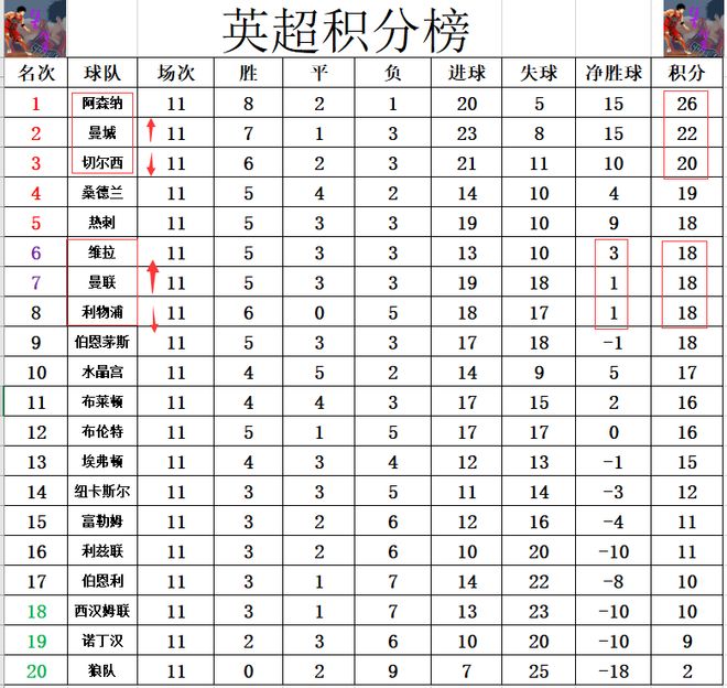 积分榜方面,阿森纳26分依然是高居榜首,曼城大胜利物浦后再次开启连胜模式,超过切尔西2分重回前2,落后榜首的阿森纳4分。惨败的利物浦被大胜的维拉超过,因为输的太多,还被曼联躺着超过,从第6继续下跌,已经是跌到第8了。