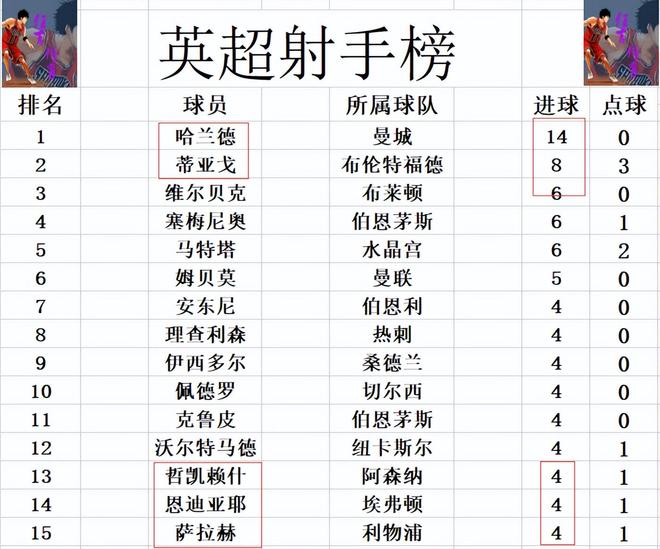 射手榜方面,哈兰德今天虽然失点,但最后也打入了一球,14球继续稳居榜首。蒂亚戈梅开二度,超过塞梅尼奥2球独居第2,落后榜首的哈兰德6球。维尔贝克,塞梅尼奥,马特塔6球并列第3。萨拉赫无力破门,还是和理查利森,哲凯赖什等人4球刚好挤入前十。