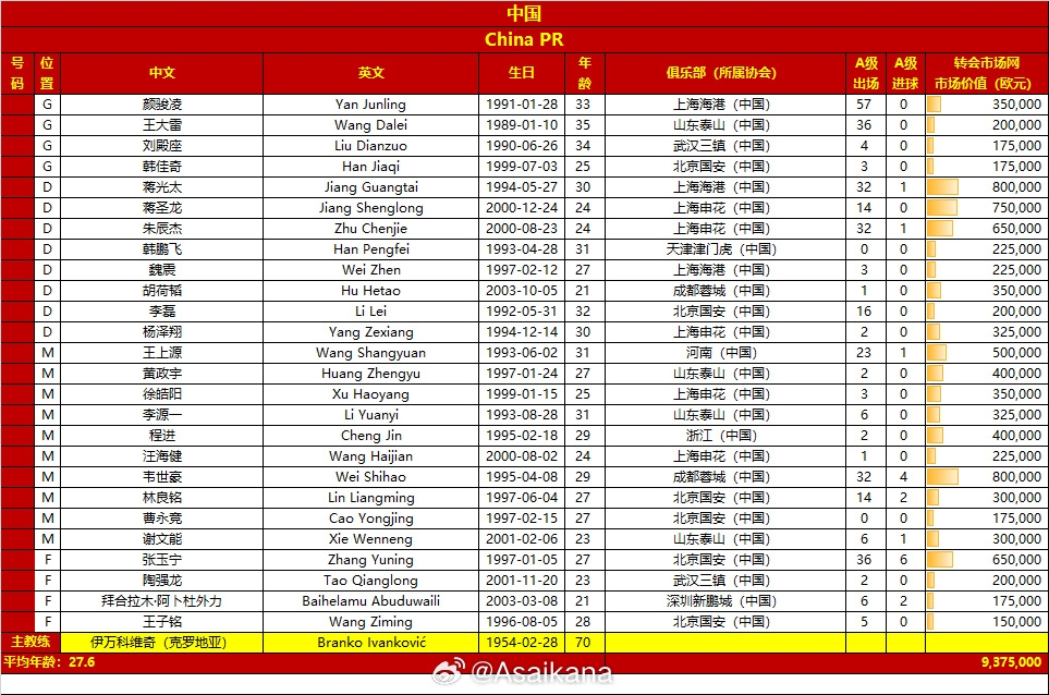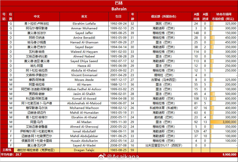 本场比赛人员方面,国足这边谢文能停赛不会登场,武磊因伤缺席。巴林的大名单则包含两名海外球员以及两名尼日利亚归化,他们的阵容近一半是效力国内豪门穆哈拉克队和里法队。