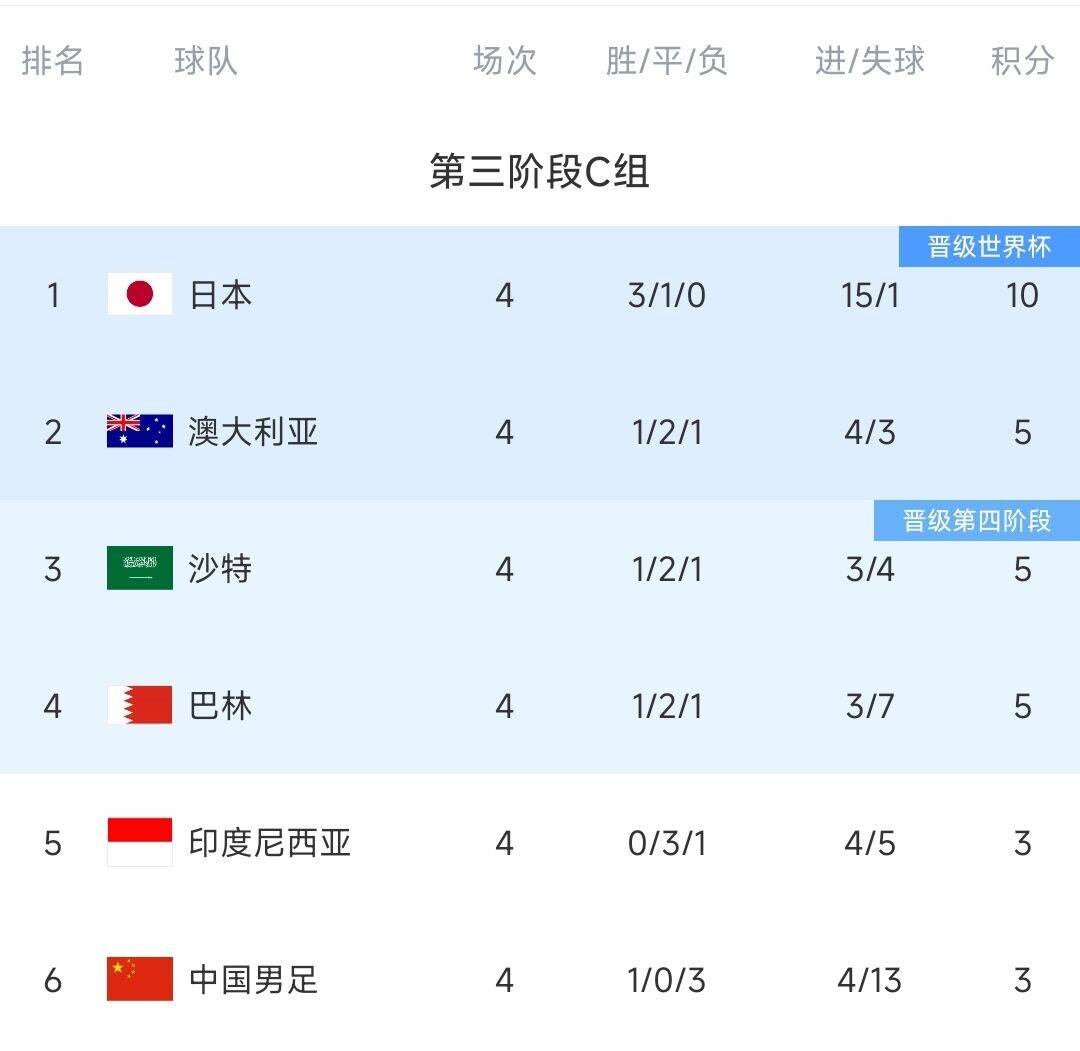 国足目前在世预赛取得1胜3负的战绩,前3场分别0-7日本,1-2沙特,1-3澳大利亚,上场则是2-1印尼,暂列积分榜最后一位;巴林此前4场1胜2平1负,分别是1-0澳大利亚、0-5日本、2-2印尼以及0-0沙特,暂列第4。