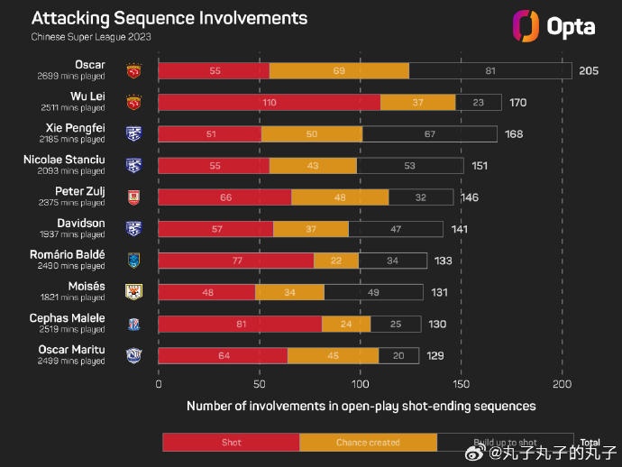 根据OPTA一项以射门终结的运动战参与进攻次数榜上,在整个中超武磊以170次排在第二,仅次于奥斯卡,这其中110次完成最后的射门,37次制造机会,23次帮助建立进攻。