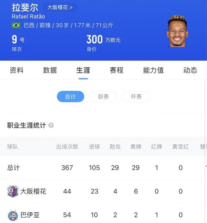 在巴伊亚时,拉唐的数据不算太好,出场54次打进10球,这进球效率并不高。也可能是拉唐的身体条件+技术能力更适合混东亚联赛吧。